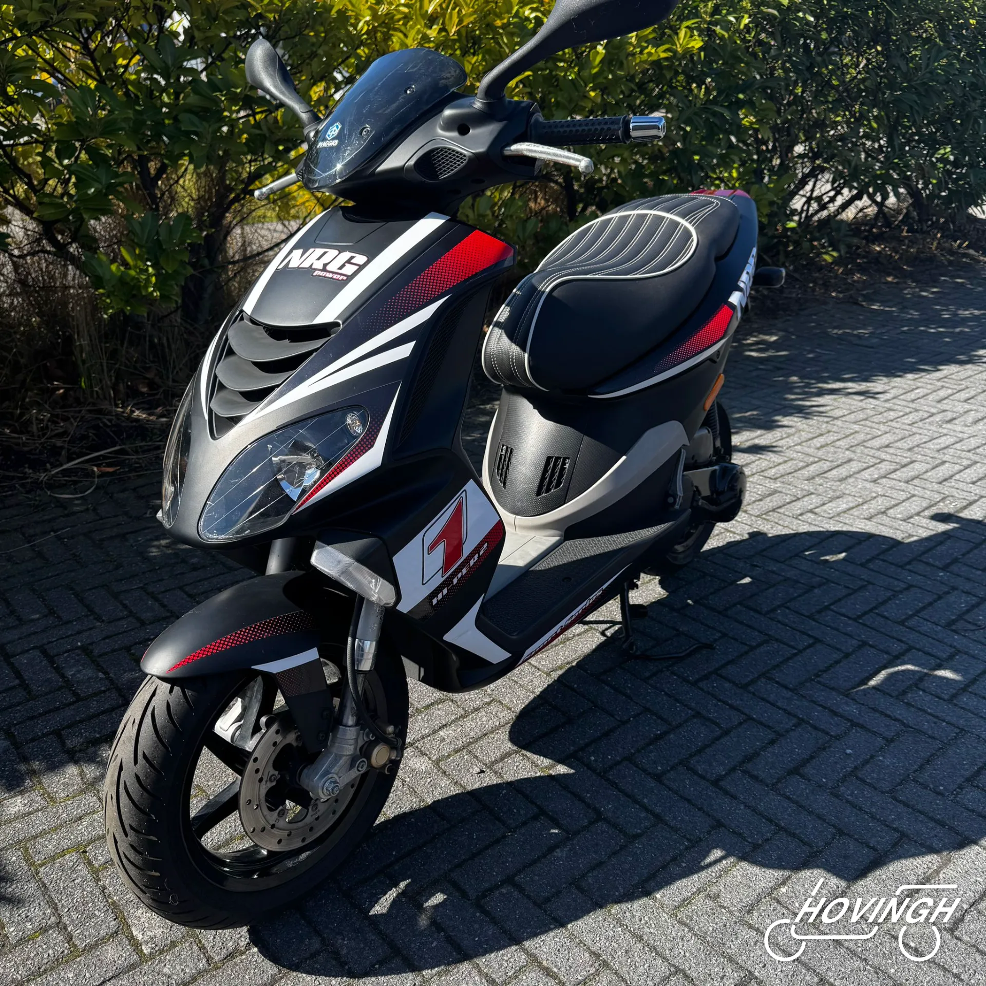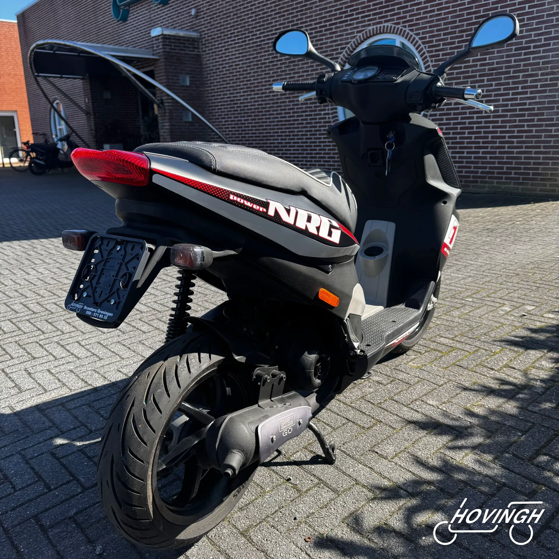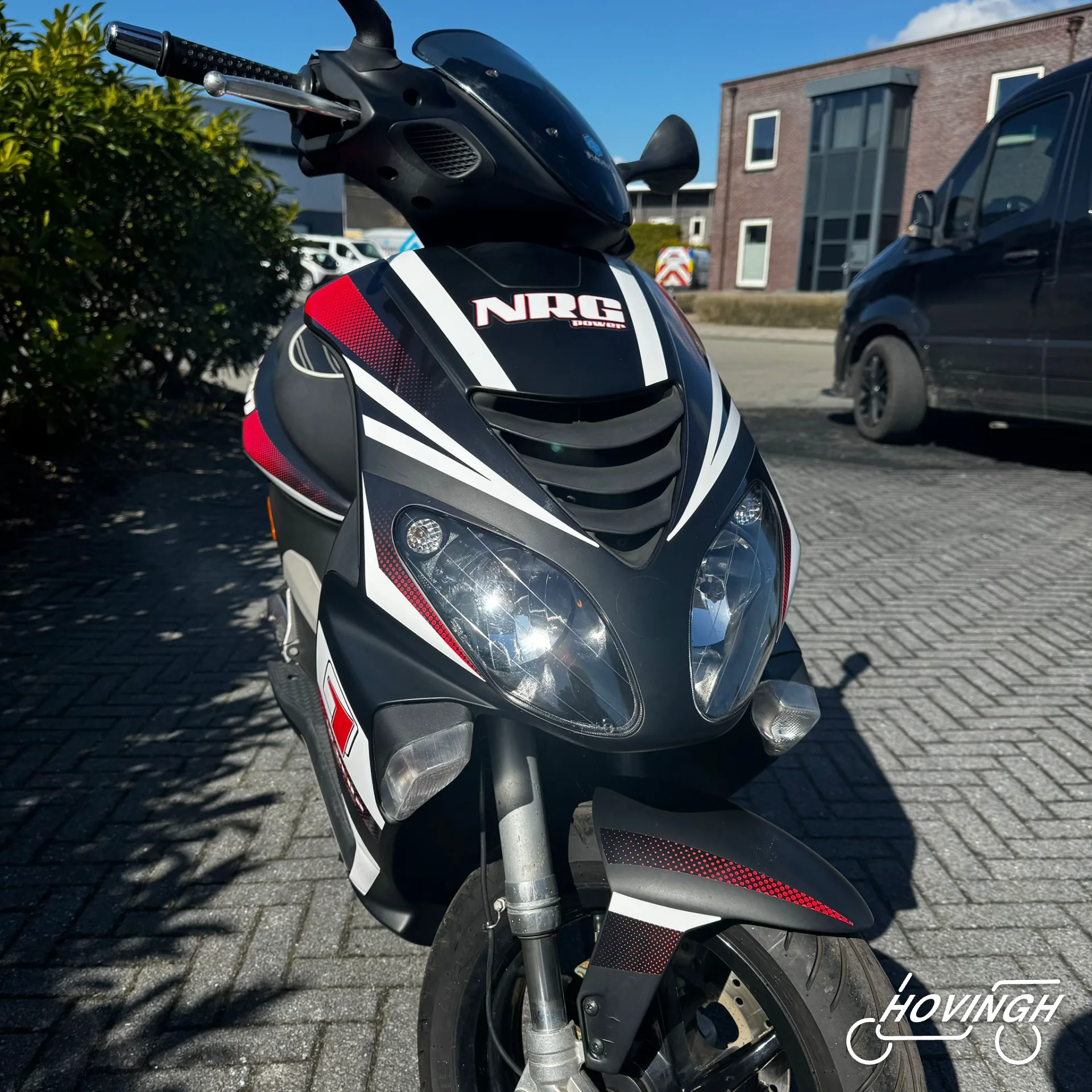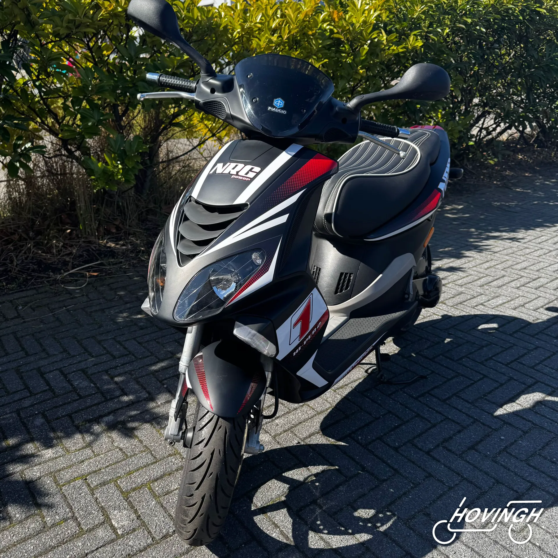 Piaggio NRG Power 2005 Zwart met rode en witte stickers — voorkant geel kenteken te koop bij Hovingh Scooters Groningen