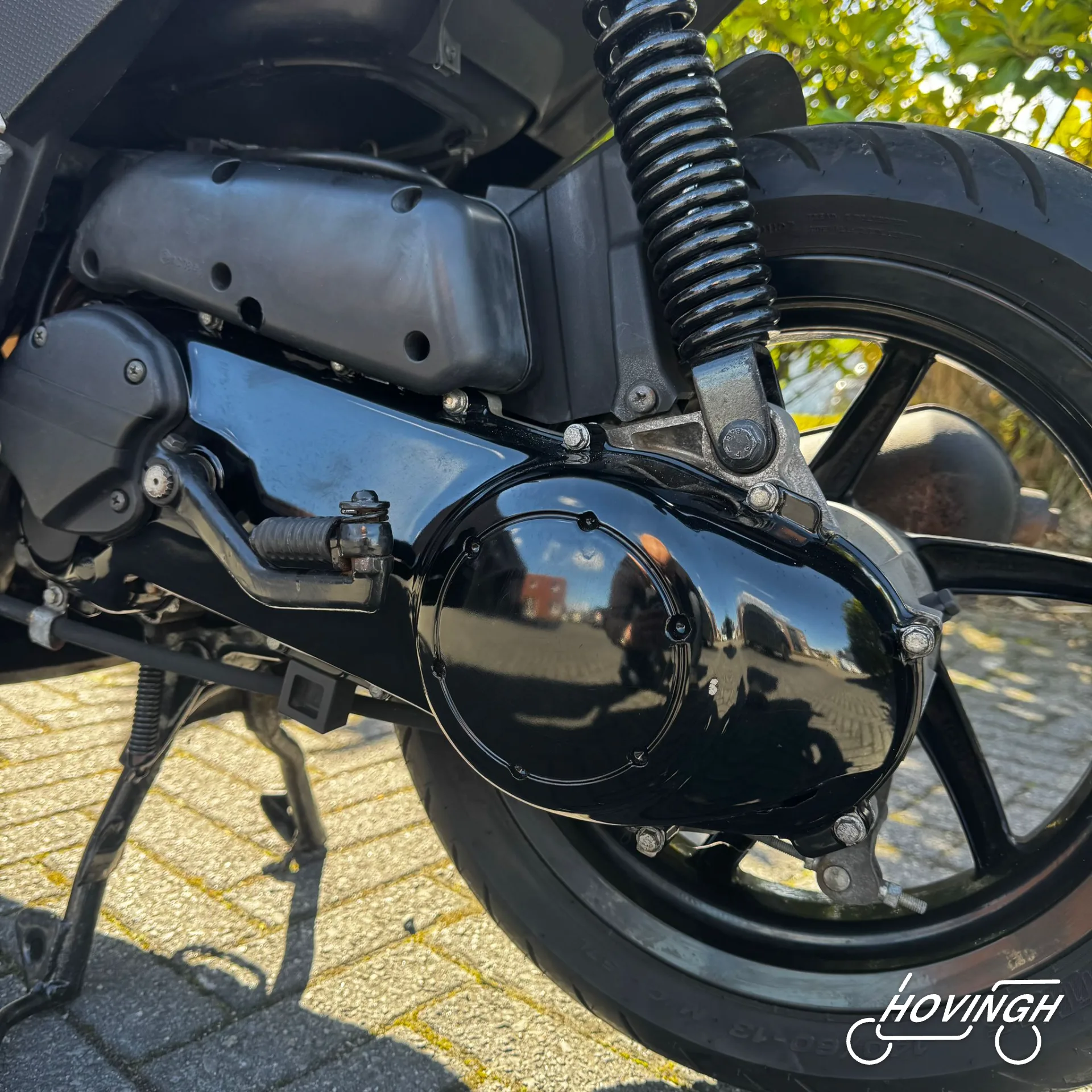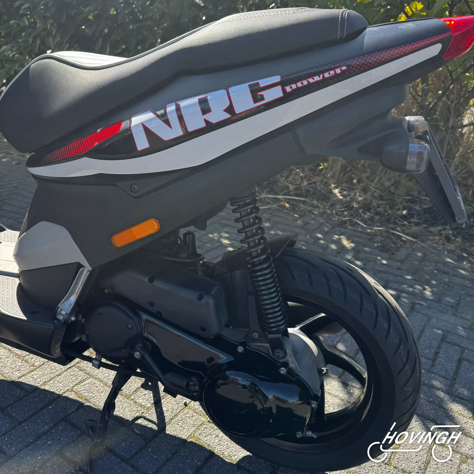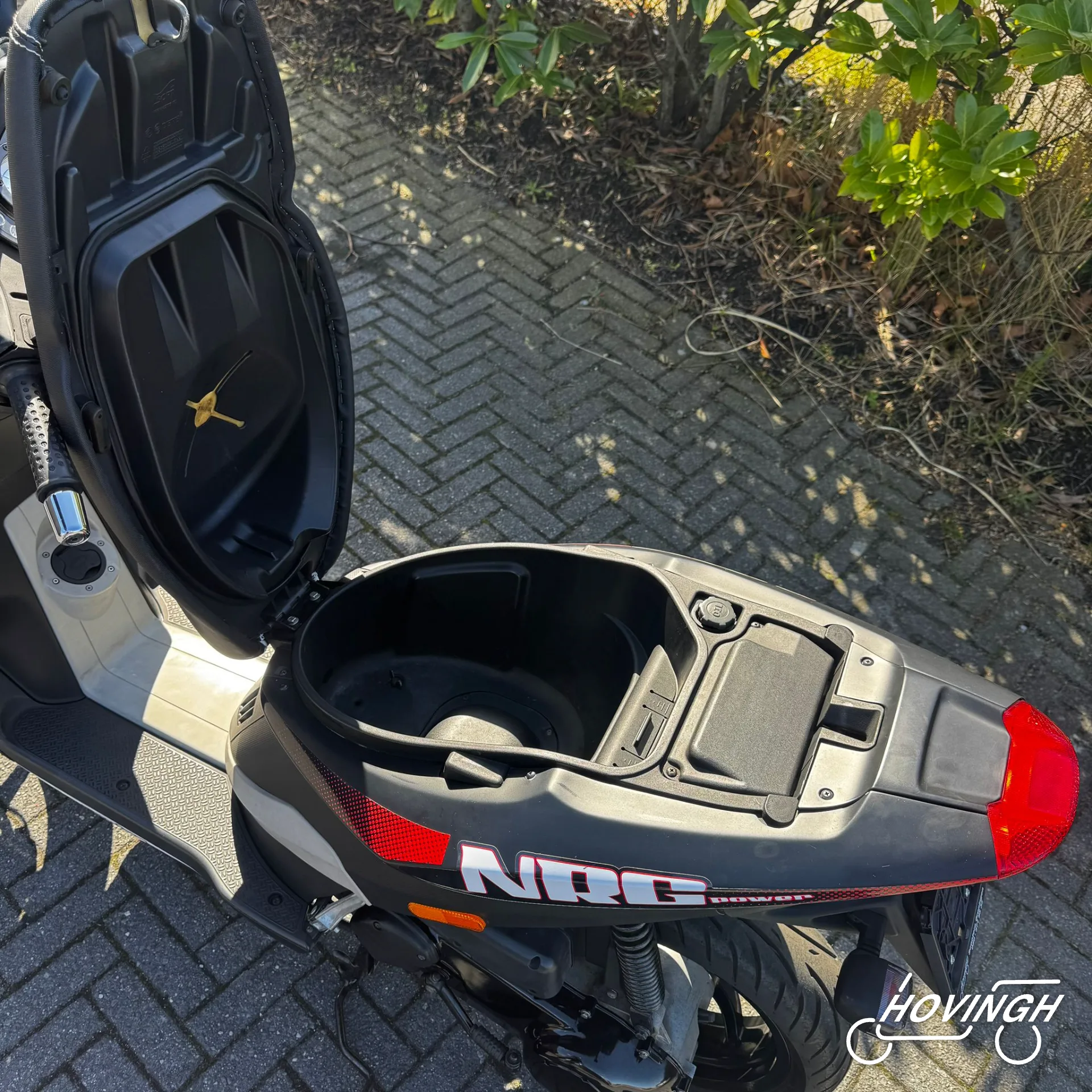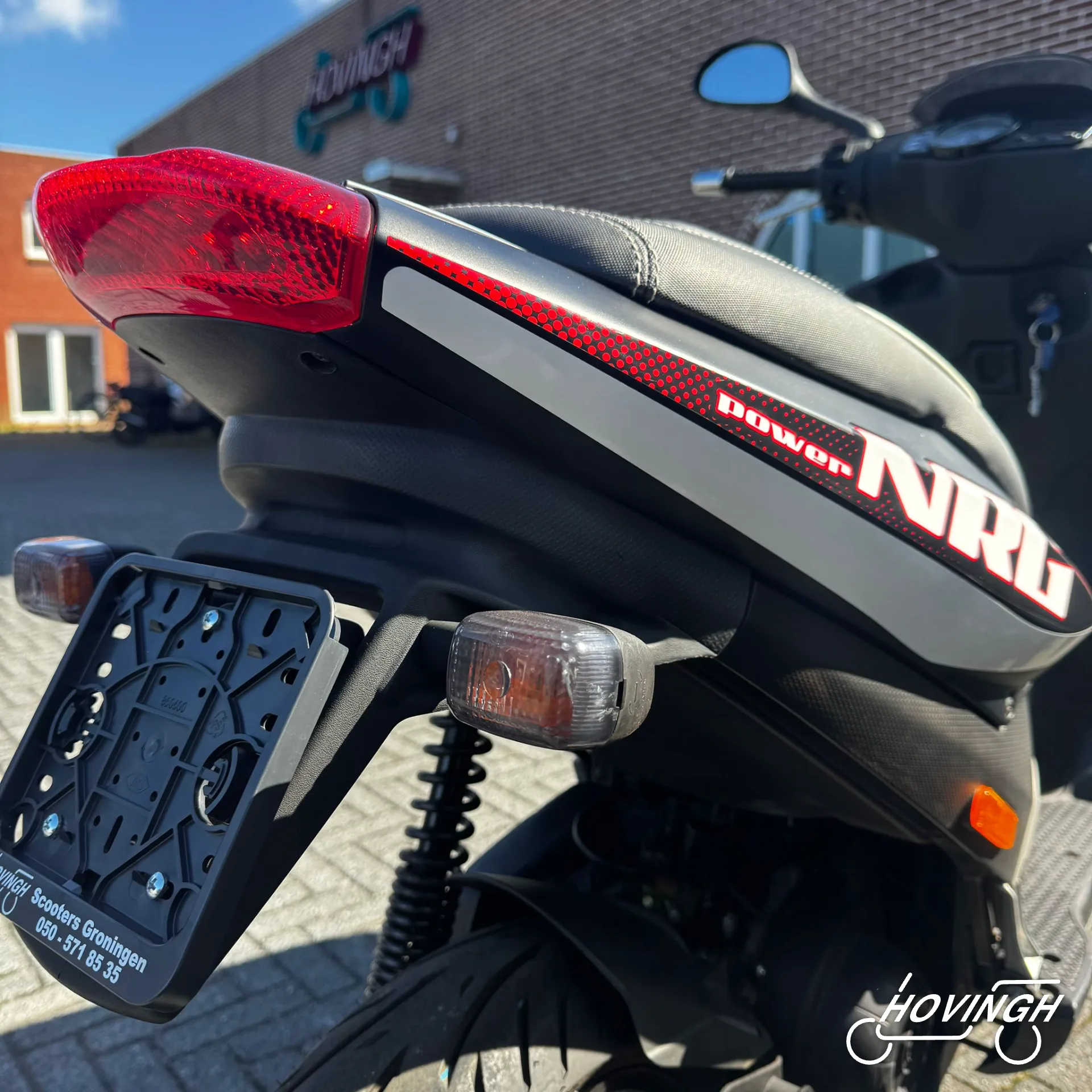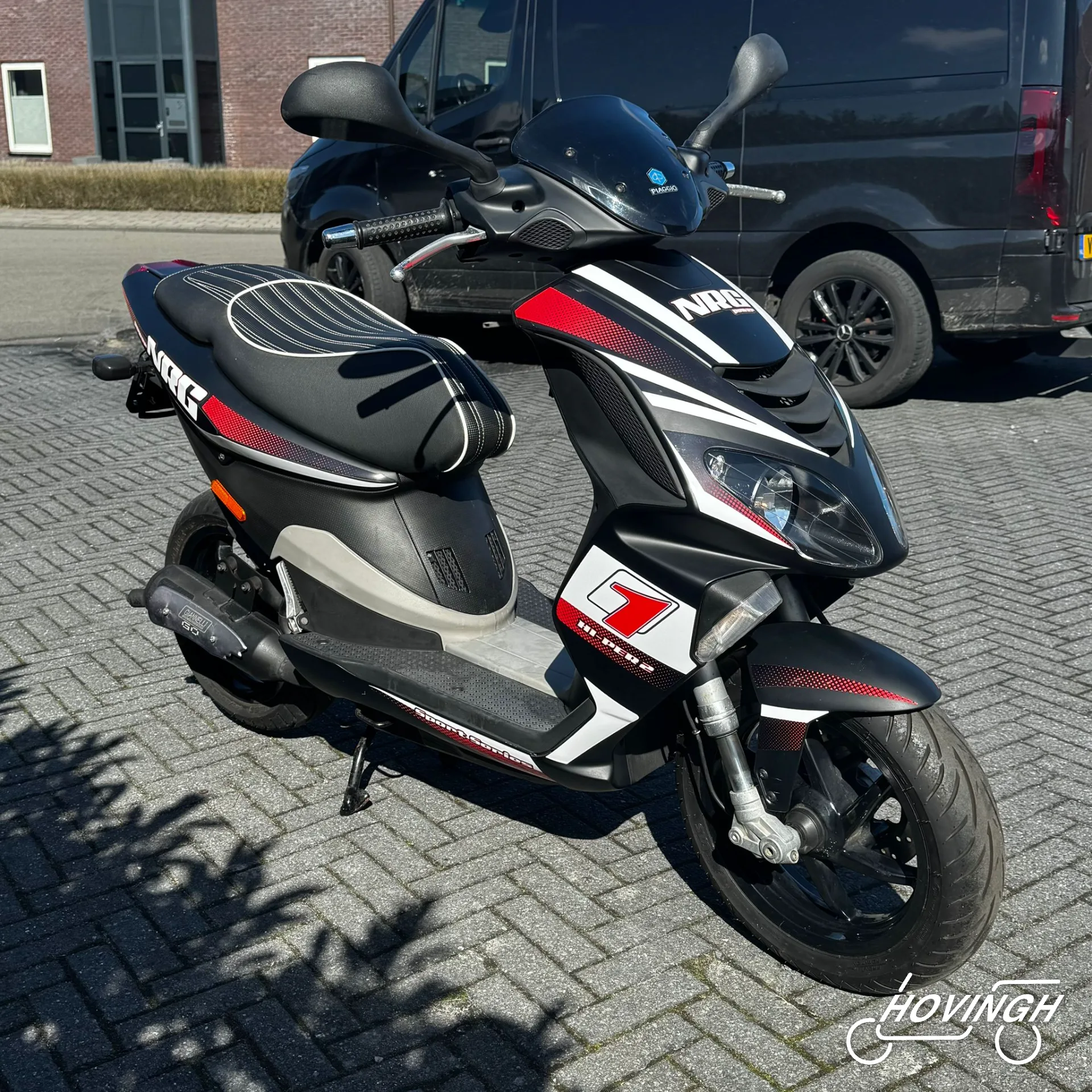Piaggio NRG Power 2005 Zwart met rode en witte stickers — voorkant geel kenteken te koop bij Hovingh Scooters Groningen